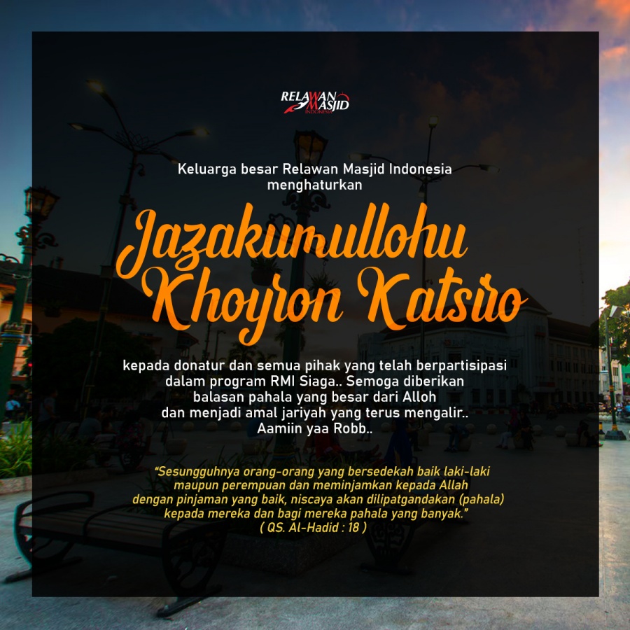 Kami ucapkan Jazakumullaahu ahsanal jaza kepada para muhsinin sekalian yang telah membantu kegiatan Relawan Masjid Indonesia, baik berupa tenaga maupun donasi.. Semoga kebersamaan ini bisa terus berkelanjutan, bisa menjadi ladang amal bagi para relawan maupun donatur sekalian..